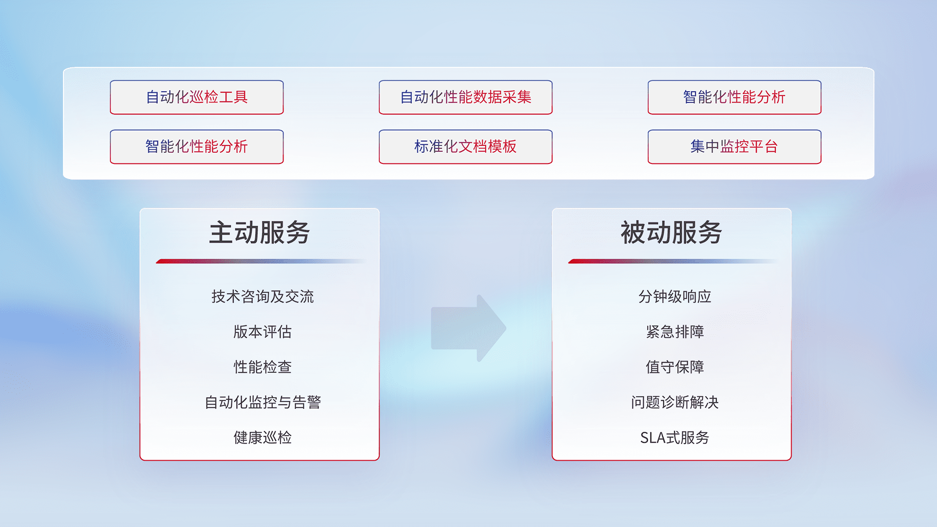 智能化工具和标准化文档,,,,保障服务质量,,,,提供主动服务(包含技术咨询、、、版本评估、、性能检查、、、、自动化监控与告警、、健康巡检)和被动服务包含(分钟级响应、、、紧急排障、、、、值守保障、、、、问题诊断解决、、、SLA服务)。。。